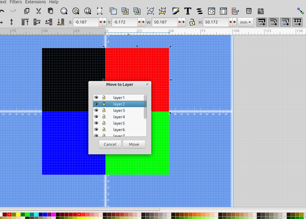 I drew another line in the other direction and cut the square into 4 parts, changed the color of each part and moved each section to it's own layer so I could handle them individually in OpenSCAD.