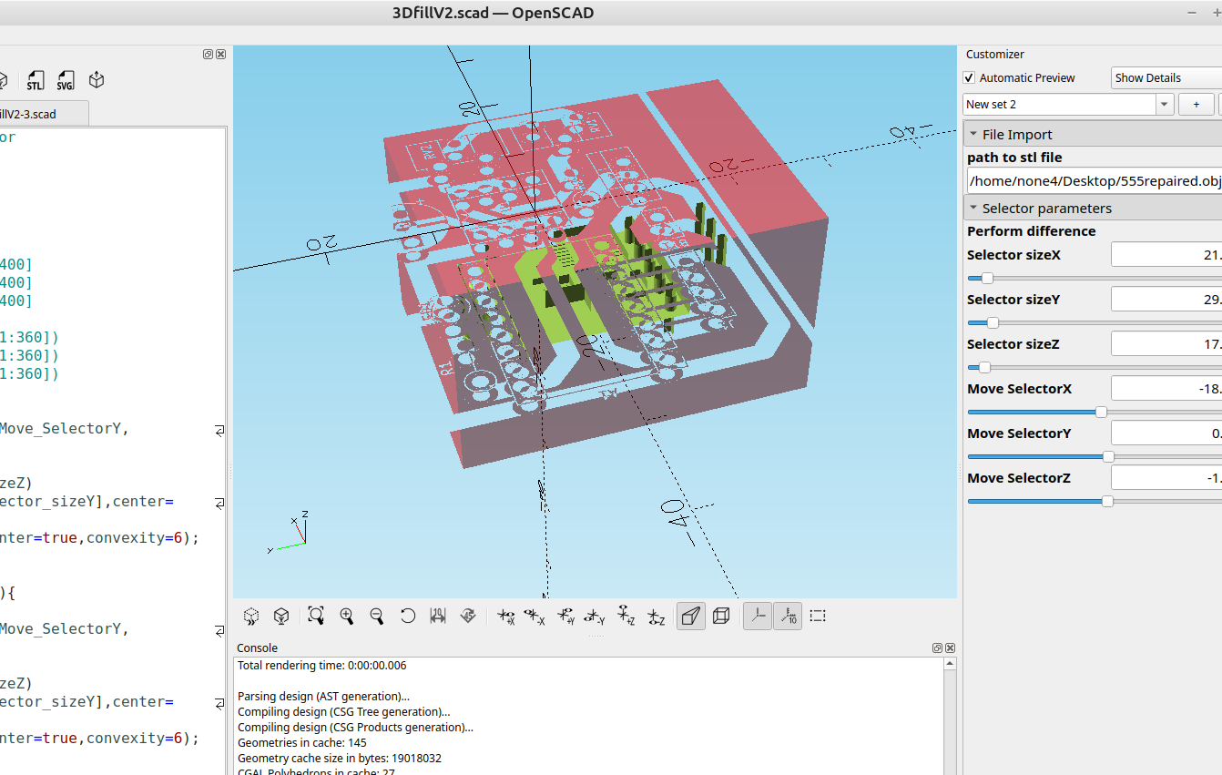 In post #131 I made what I called a "3d fill" module that filled in the empty spaces of a 3d object. In this post I'm going to add to that with a selector that you can move, cut out the section you want to use and then fill it back in to clone the item.