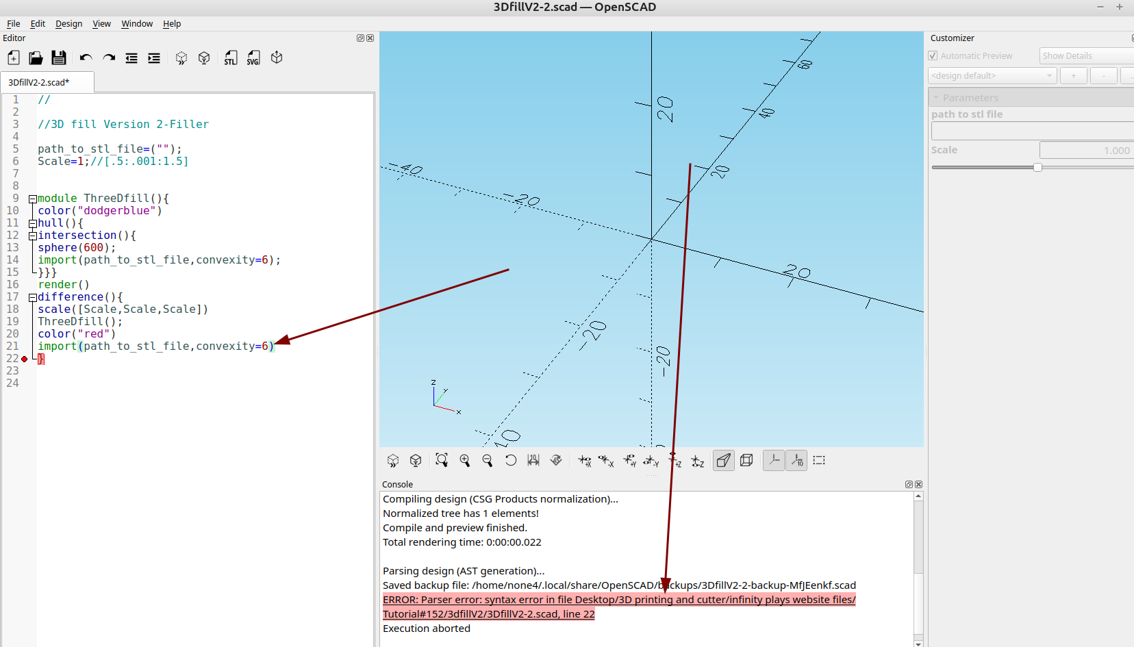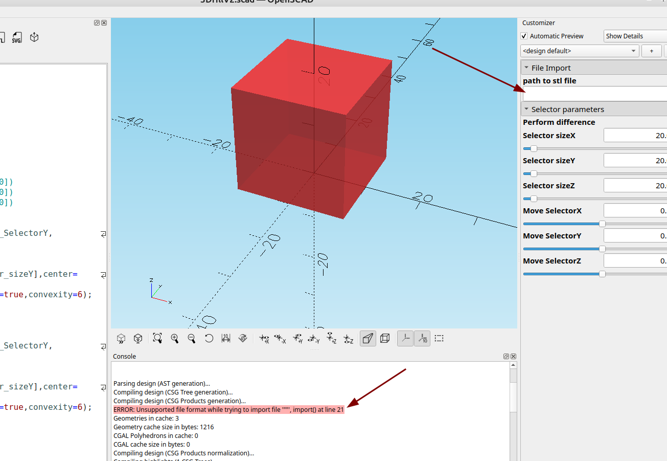 It shows an unsupported file format error, the only problem is I didn't enter a path to the stl file and once I enter the path everything works fine. So long story short if you are having error codes pop up don't get discouraged it's probably a simple fix.